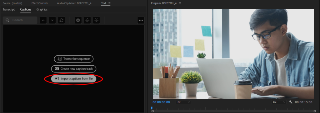- Left-click “Import captions from file” in the “Captions” section under “Editing.”