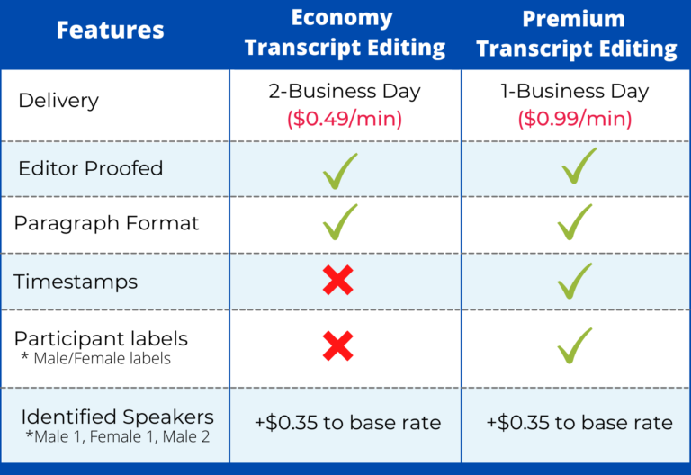 We understand that transcript accuracy is important, and part of getting it accurate is knowing who said what. With our Premium Proofing service, not only will our team of editors make your machine transcript as accurate as they can, but they will also add in speaker labels. Timestamps will also be included on a per minute basis.